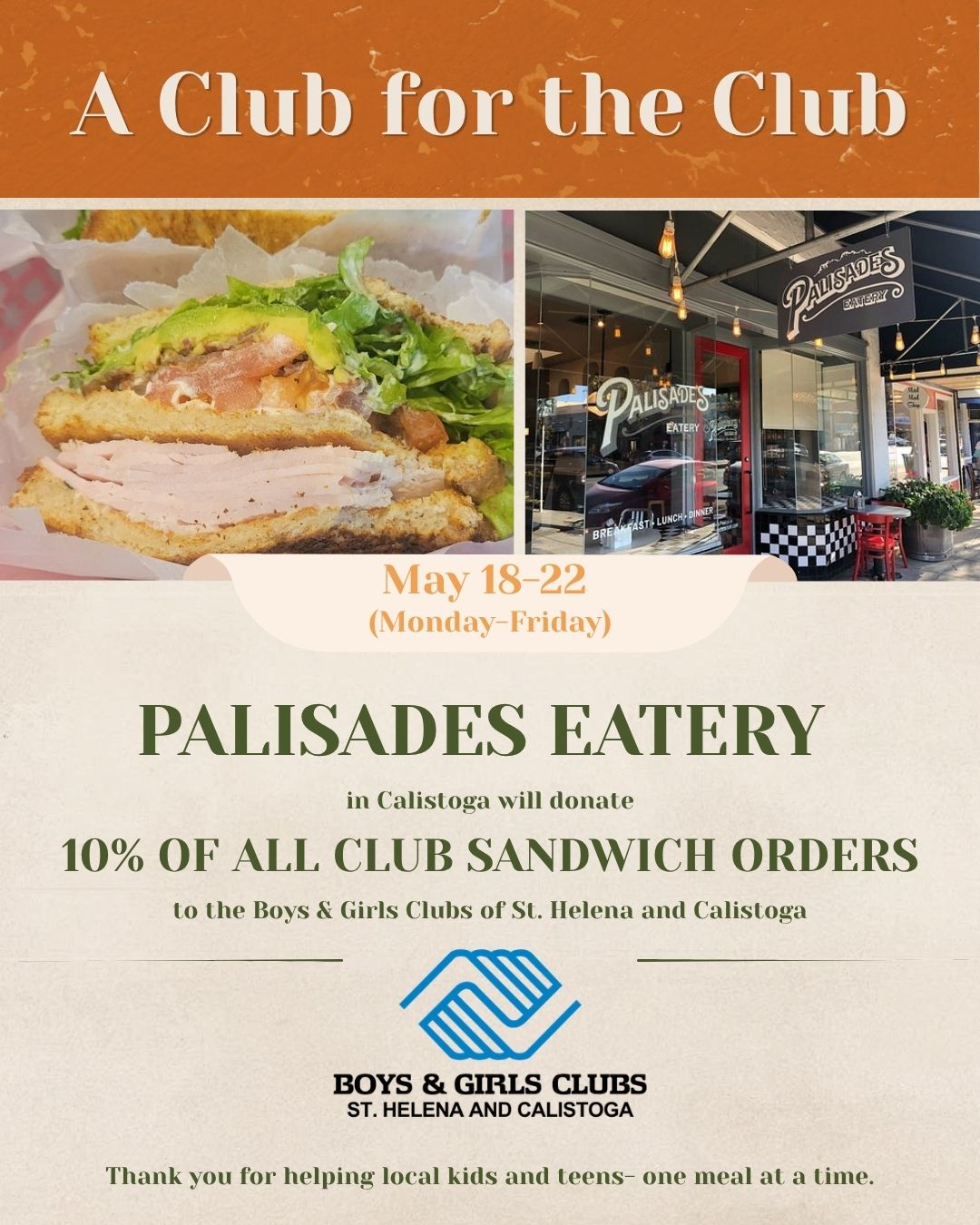 During this special “Club for the Club” promotion, 10% of all Club Sandwiches sold will be donated to the Boys & Girls Clubs of St. Helena and Calistoga. Just order a Club Sandwich and your meal will help support programs that provide a safe, supportive place for local kids and teens to learn, grow, and thrive.