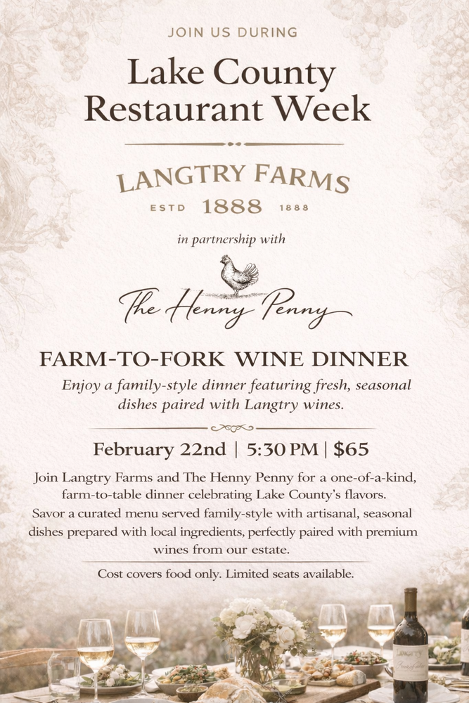 Langtry Farms and The Henny Penny invite you to a one-of-a-kind Family-Style Farm-to-Table Wine Dinner. Savor a curated menu of fresh, seasonal dishes crafted to showcase the best of Lake County’s flavors. Perfectly paired wines from Langtry Farms will be available for purchase, allowing you to enjoy the ideal pairing with your meal.