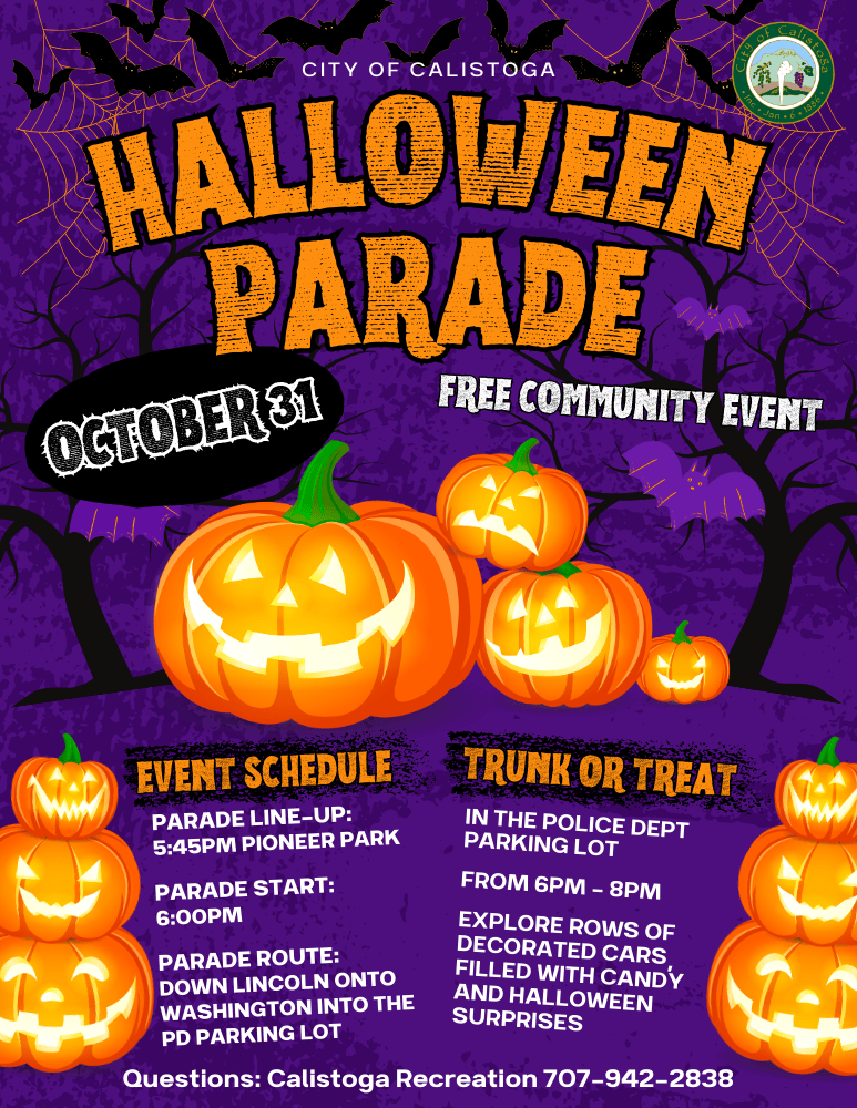 Join the fun on Friday, October 31, as the Annual Halloween Parade returns as a City of Calistoga event. Families line up at 5:45 p.m. in Pioneer Park, and the parade steps off at 6:00 p.m. down Lincoln Avenue, ending at the Community Center and Police Department parking lot. Following the parade, enjoy a brand-new Trunk or Treat from 6:00–8:00 p.m., featuring decorated cars, candy, and festive family fun.