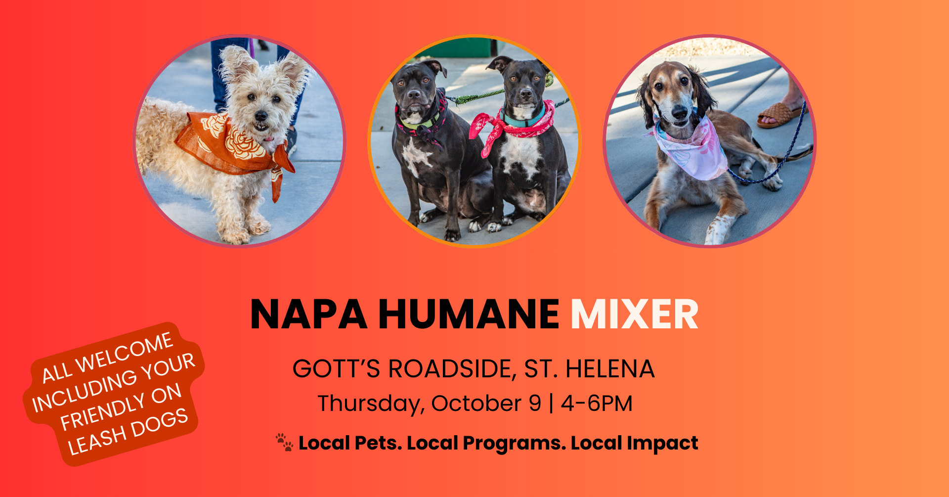 Join us for Napa Humane’s October Mixer on Thursday, October 9 from 4:00-6:00 pm at Gott’s Roadside, St. Helena. Enjoy an evening of good food, great conversation, and community spirit—all in support of local pets.